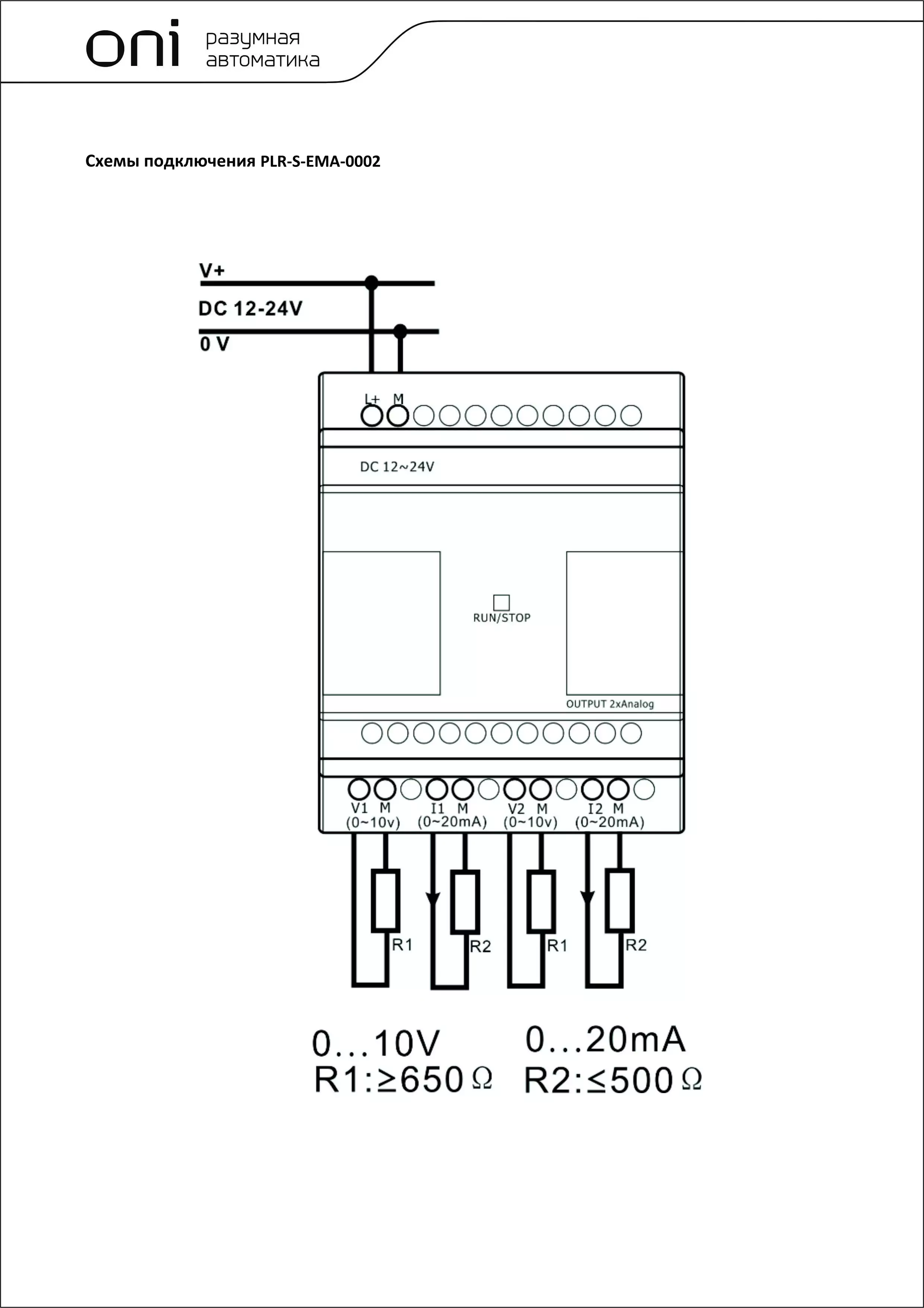 Модуль расширения 2 каналами аналогового вывода (0..10В/0..20мА). Предназначен для увеличения используемых каналов аналогового вывода программируемого логического реле ONI PLR-S. Напряжение питания 12-24 В DC.