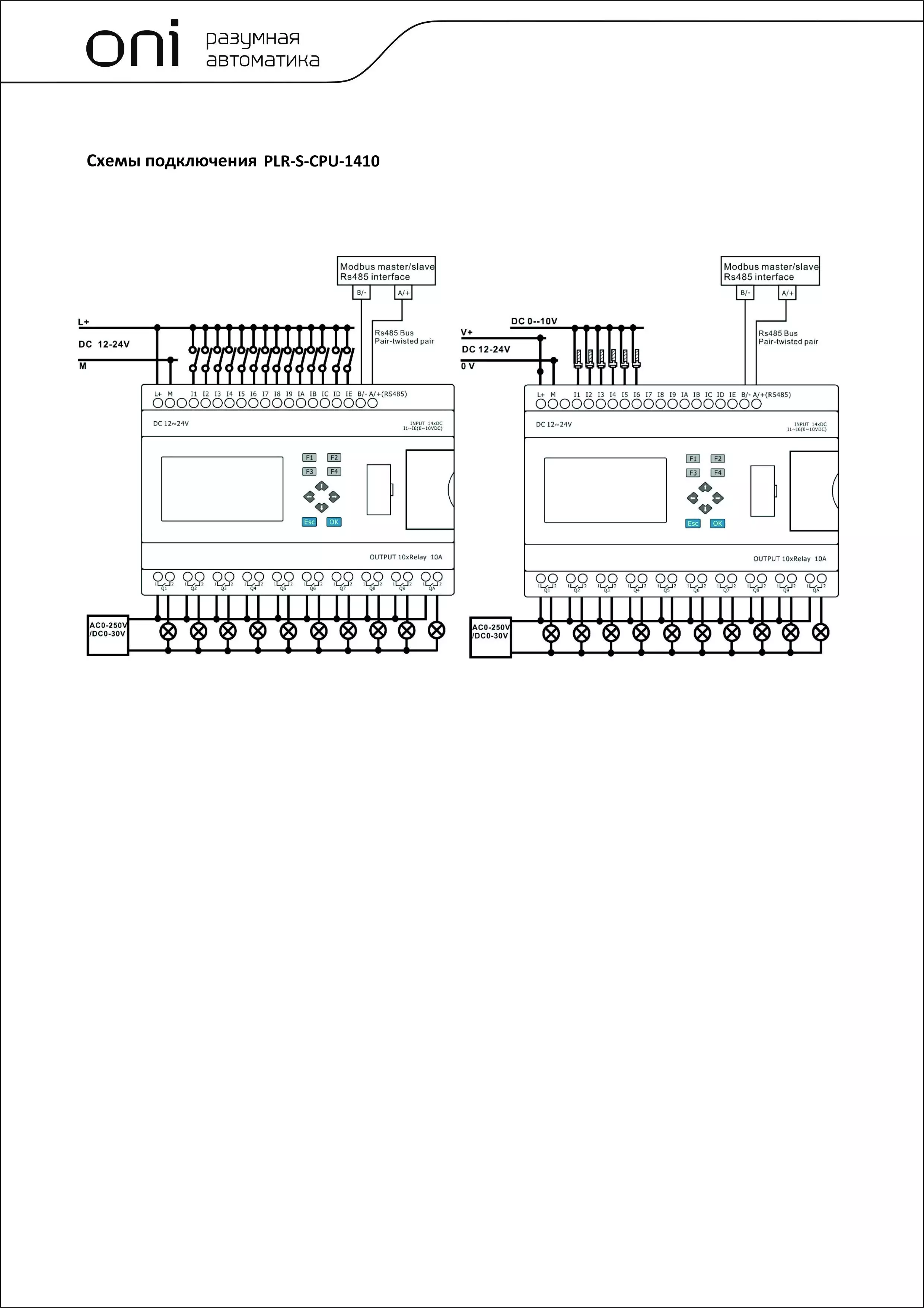 Программируемые логические реле ONI PLR-S имеют интерфейс RS485 с широко распространенным протоколом связи Modbus RTU. При этом они способны работать как в режиме Master, так и в режиме Slave не только с дополнительным коммуникационным модулем, но и в версиях с интегрированным интерфейсом в модуле ЦПУ.